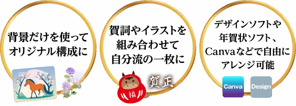 “贈る”だけじゃない、“創る”楽しさも。年賀状デザインは、完成デザインとして印刷しても美しく、パーツを使って自分でカスタマイズしても楽しめる仕様。